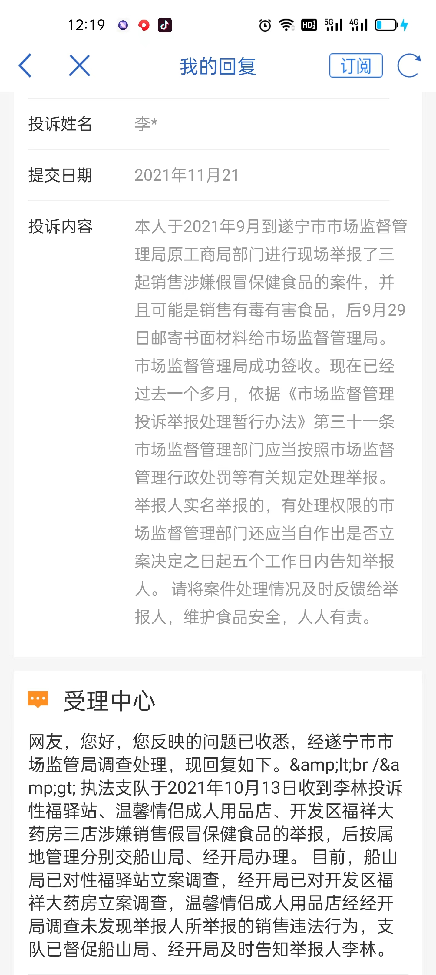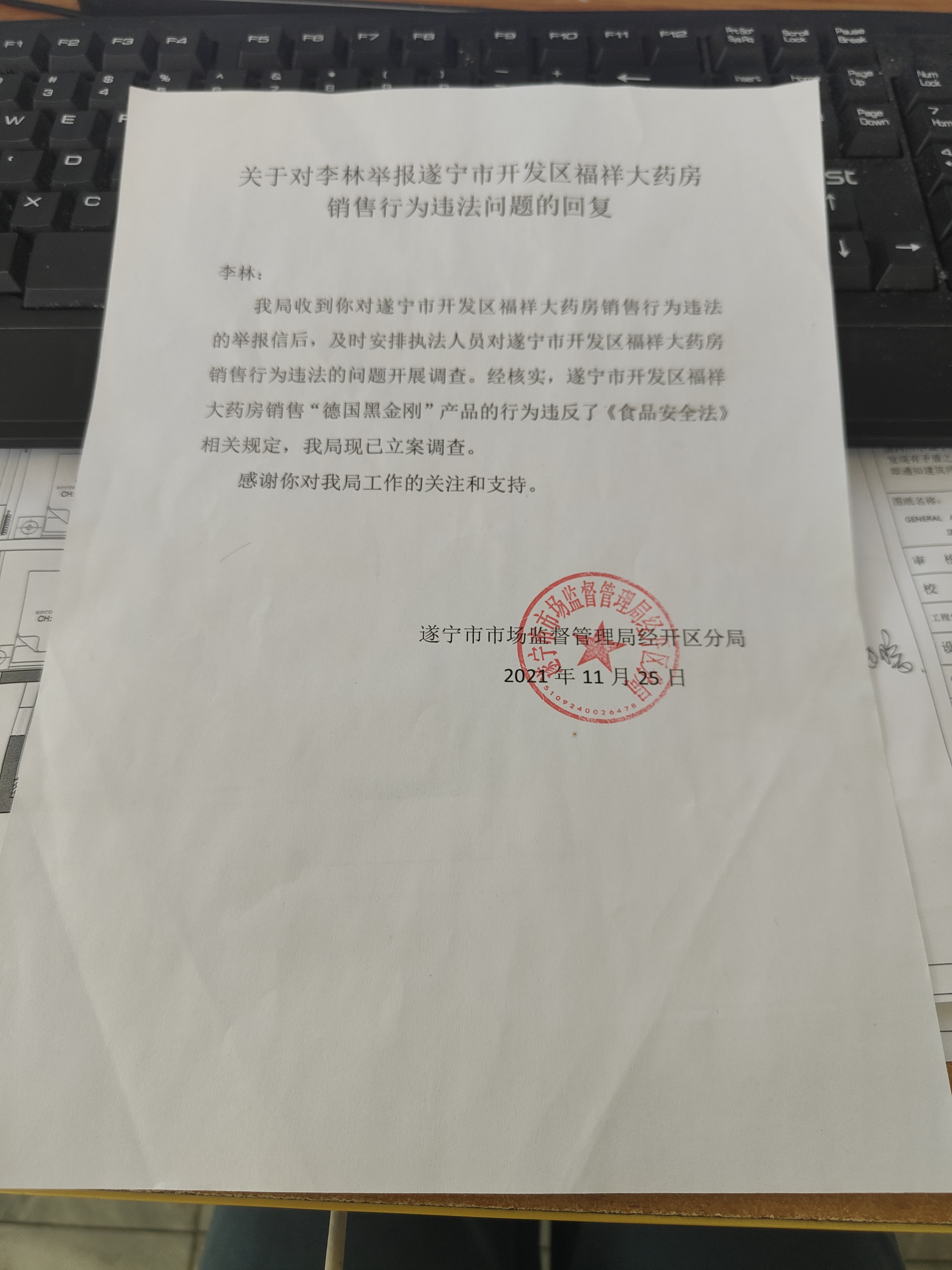 2021年本人到遂宁市市场监督管理局 举报开发区福祥大药房销售假冒保健食品,后转交给经开区监管局办理,后经过本人申请2021年11月25日经开区回复正在立案调查,2022年1月经开区市场监管局作出行政处罚对被举报人处以罚款2万元。本人举报时间发生在2021年10月依据当时的法律《食品药品违法行为举报奖励办法》 第九条举报奖励根据举报证据与违法事实查证结果,分为三个奖励等级: