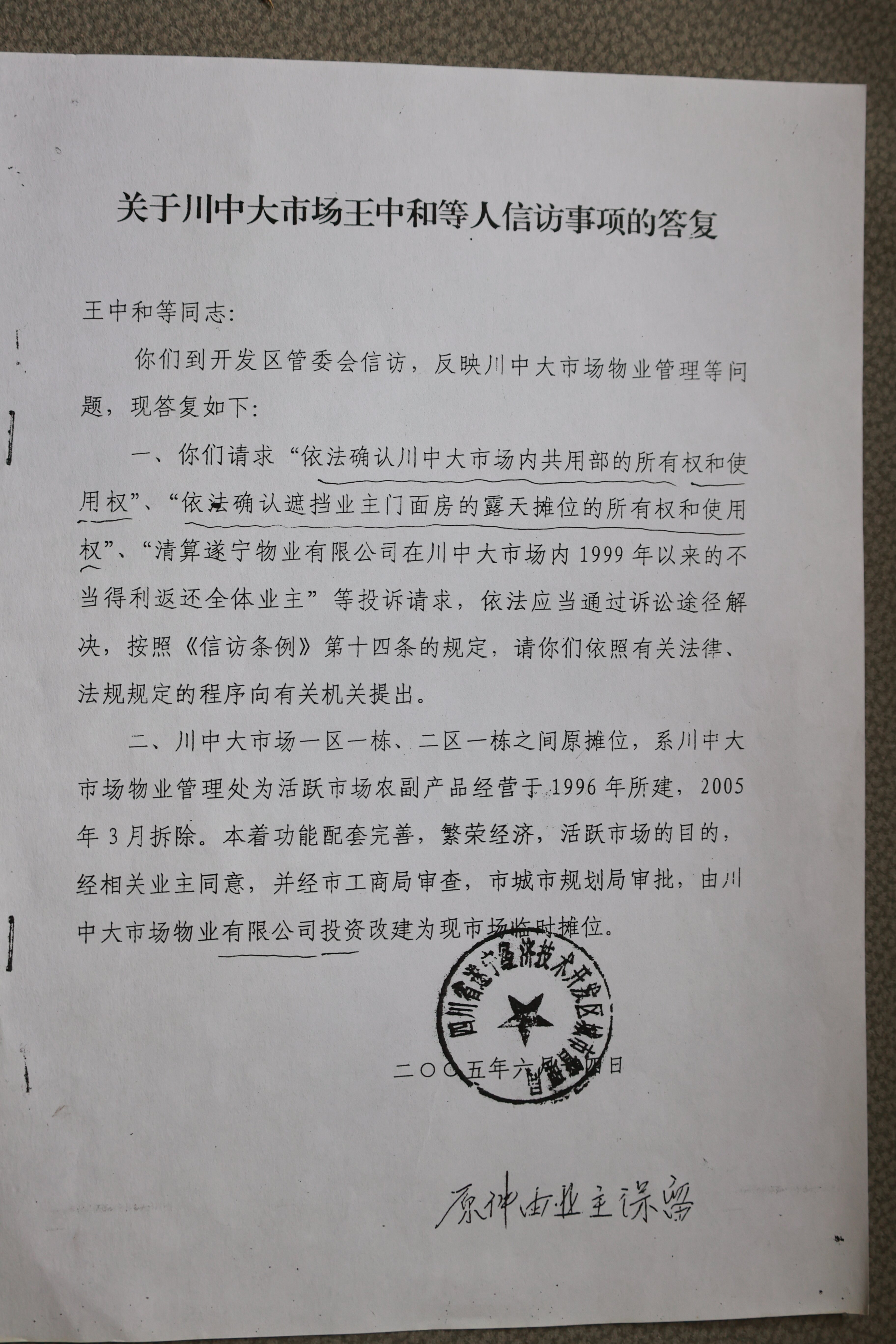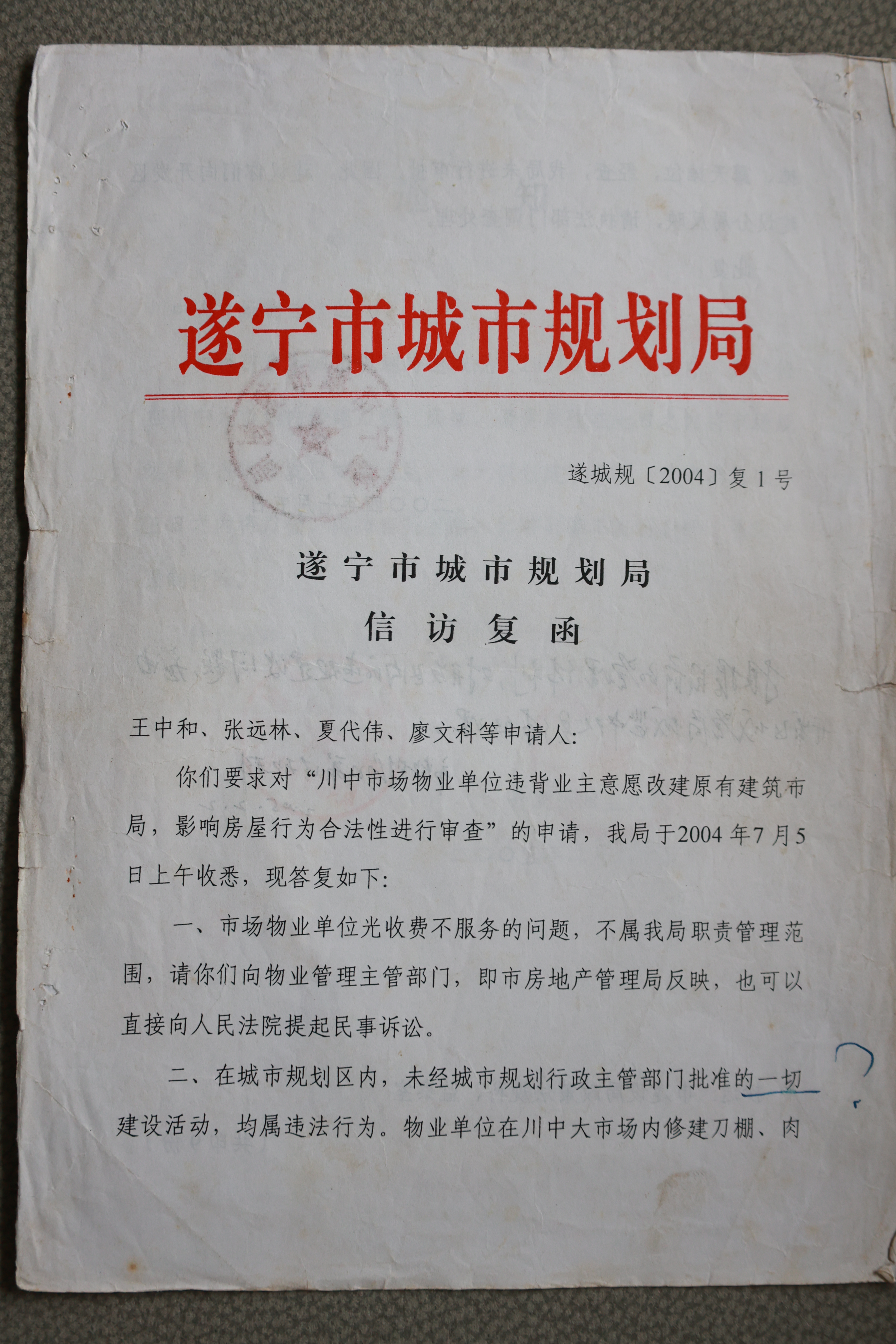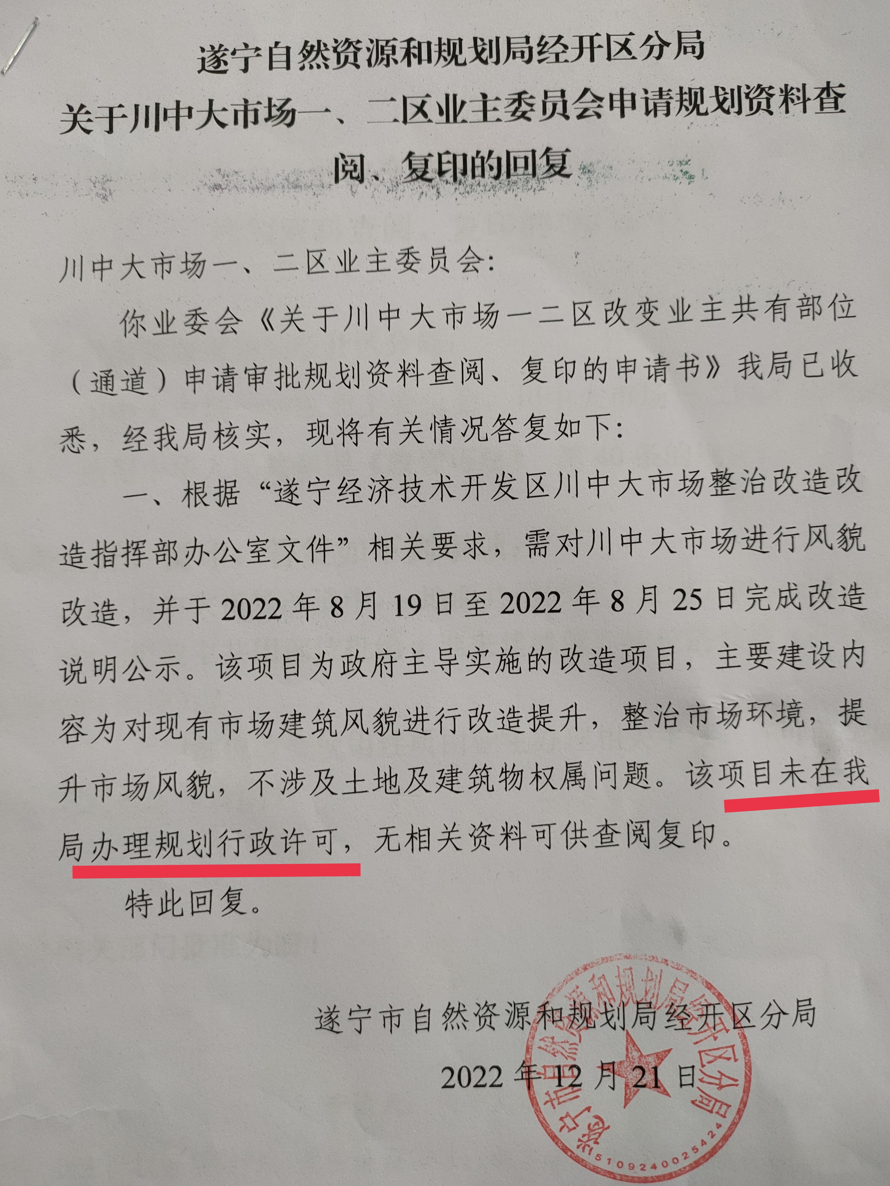 遂宁市城市管理行政执法局经开区分局: 2022年11月起川中大市场内开始在共用部位、内部道路搭建摊位,川中大市场一二区业主委员会向遂宁市自然资源规划局经开区分局反映。 2022年12月21日遂宁市自然资源规划局经开区分局答复,川中大市场搭建摊位未办理规划许可,无资料可查。 2004年原开发商遂宁物业有限公司开始建摊位,遂宁市城市规划局答复遂成规(2004)复1号摊位未经批准;今年大规模搭建又没有办理规划相关手续。