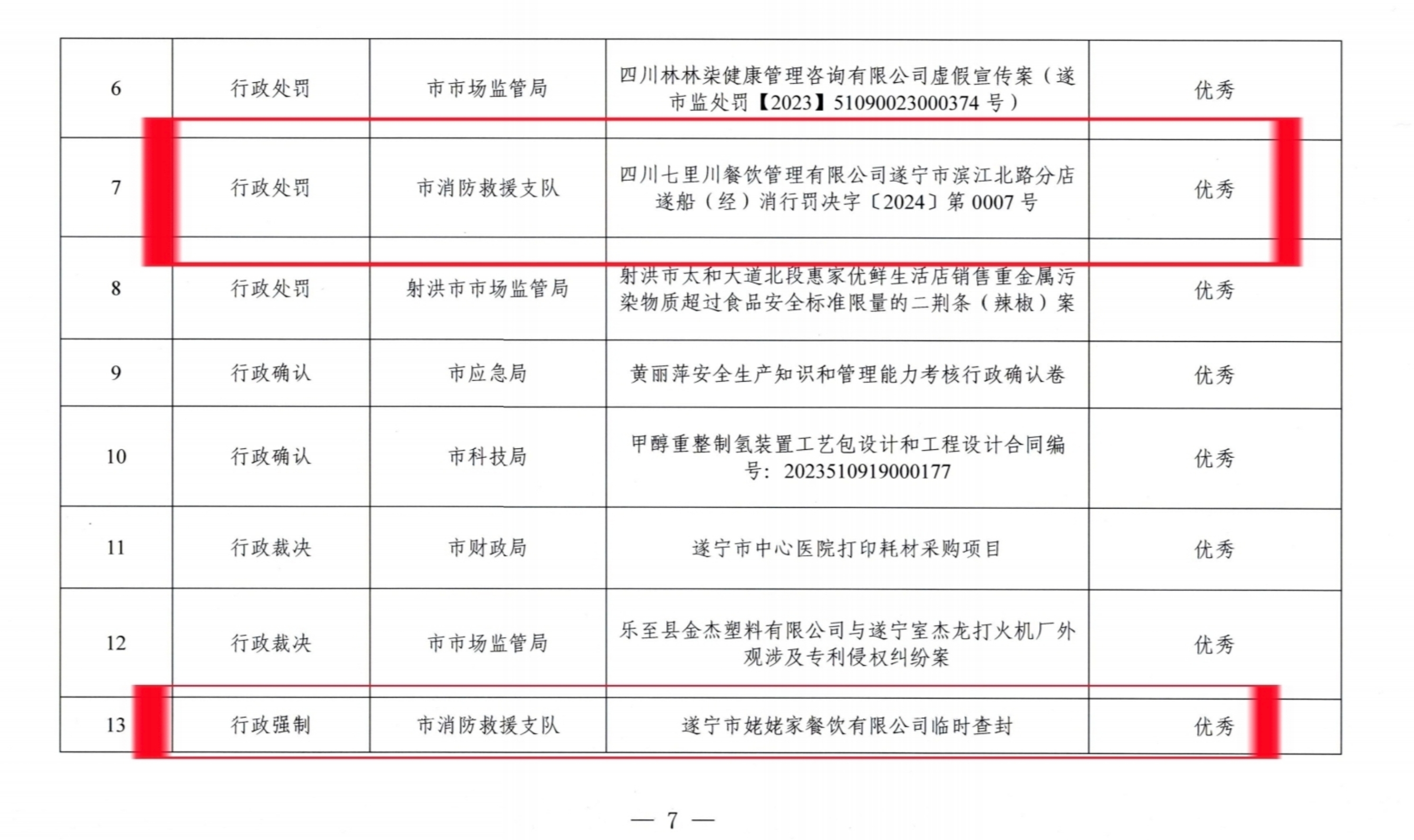 近日,在遂宁市司法局、潼南区司法局联合开展的遂潼两地涉企行政执法案卷互查互评工作中,由经开消防救援大队(筹备组)主办的《四川七里川餐饮有限公司遂宁市滨江北路分店未经消防救援许可,擅自投入使用、营业行政处罚案》和《遂宁市姥姥家餐饮有限公司采用易燃、可燃材料装修临时查封案》两起案件,从参评的百余份案卷中脱颖而出,获评“优秀案卷”。此次评查结果充分彰显了经开消防救援大队在规范执法、提高案件办理质量工作中的扎实成效。