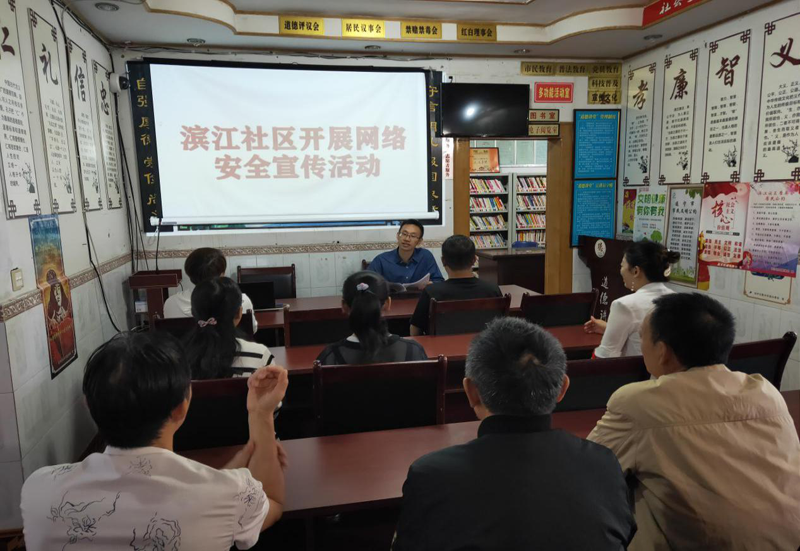 9月16日,滨江社区工作人员通过播放网络安全视频,面对面向群众宣传网络安全知识,讲解如何提高网络安全意识、防止电话诈骗、防范钓鱼网站及正确理财、杜绝非法融资等知识。同时,社区还开展了《中华人民共和国网络安全法》宣讲活动。