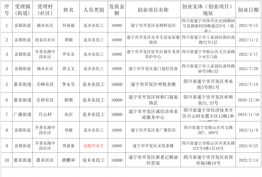 遂宁经济技术开发区2025年3月创业补贴公示名单