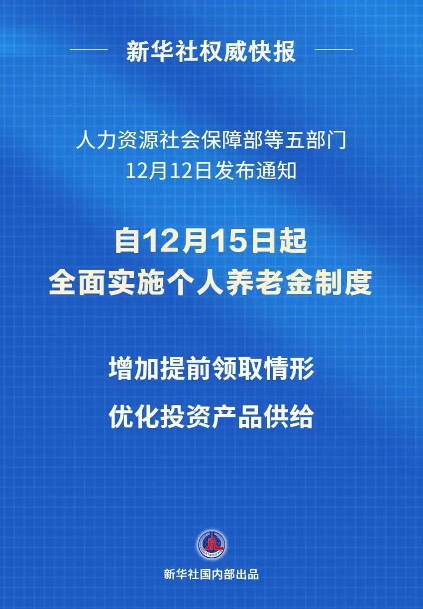12月12日人力资源社会保障部等五部门发布《关于全面实施个人养老金制度的通知》自12月15日起个人养老金制度从36个先行试点城市(地区)推开至全国所谓个人养老金就是个人自愿参加、市场化运营、国家政策支持的补充养老保险制度个人自愿在特定账户存一笔钱每年不超过12000元购买符合规定的金融产品到达退休年龄时又多一个养老金来源、作为基本养老保险的补充与普通银行理财或基金、商业保险不同个人养老金缴费可享受延期征税的优惠政策为推动个人养老金保值增值通知要求优化产品供给在现有理财产品、储蓄存款、商业养老保险公募基金等金融产品基础上将特定养老储蓄、指数基金纳入个人养老金产品目录通知还增加了提前领取情形除达到领取基本养老金年龄、完全丧失劳动能力出国(境)定居外参加人患重大疾病、领取失业保险金达到一定条件或者正在领取最低生活保障金的可以申请提前领取个人养老金
