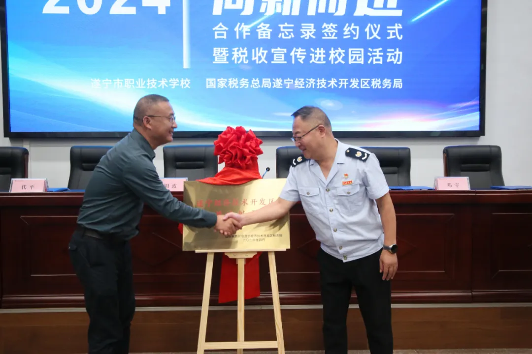 活动现场,遂宁市职业技术学校党委委员、副校长张兵和国家税务总局遂宁经济技术开发区税务局党委书记、局长胡波签订了合作备忘录,并共同为“遂宁经济技术开发区税收普法教育基地”揭牌。