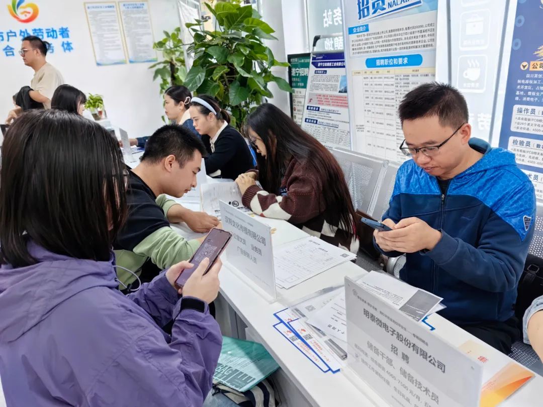 活动现场,前来“招兵买马”的各家企业早早摆好招聘需求信息展板和宣传单,等待求职者前来问询;求职者们认真浏览招聘简章,筛选符合要求的岗位,与人事专员仔细交流,表达自己的就业意向,了解薪资待遇、工作环境、权益保障等事项,有意向者留下了自己的基本资料和联系方式。