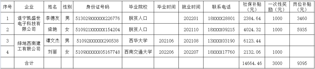 按照《遂宁市人民政府关于印发进一步稳定和扩大就业十八条政策措施的通知》(遂府函〔2022〕74号)精神,我区受理了四川联恺照明有限公司吸纳高校毕业生就业相关补贴的申请,经核,符合条件4人,应补贴金额27059.46元。现将受理审核情况向社会公示,公示期5个工作日,自2022年9月2日至9月6日。公示期间,如有问题和意见,请及时向遂宁经济技术开发区劳动保障与民政事务局反映。