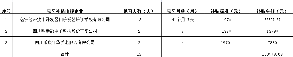 根据遂人社办发[2018]79号关于加强高校毕业生就业见习工作的通知,现将就业见习补贴发放情况予以公示。补贴企业3家,补贴资金103979.69元,补贴人数12人,如有情况反映,请12月31日前与遂宁经济技术开发区劳动保障与民政事务局联系。