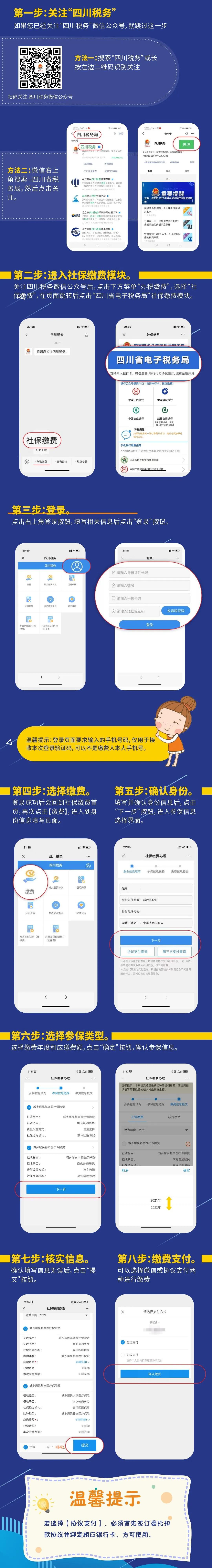 在第六步的选择参保类型操作,选择“城乡居民养老保险”即可。如果此处没有“城乡居民养老保险”选项,建议拨打参保地12333联系当地社保经办部门,重新推送您的参保信息到税务部门,信息同步后就可以缴费了。