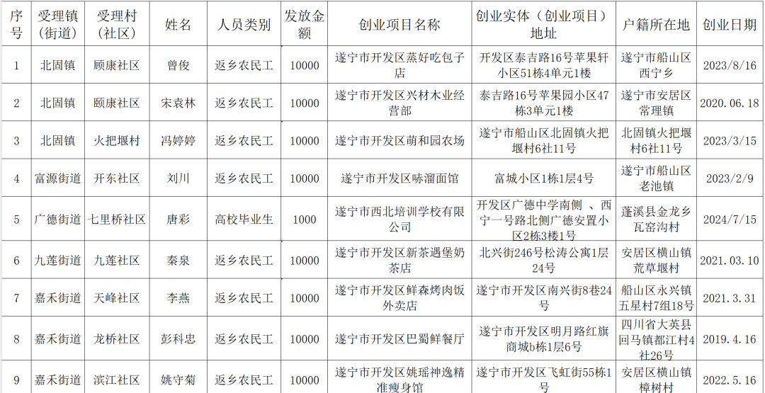 遂宁经济技术开发区2024年8月创业补贴公示名单