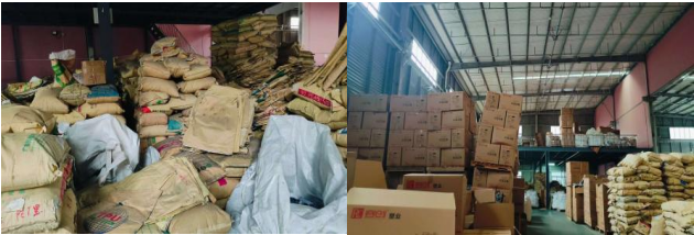 隐患一:丙类货物堆放未分类且堆放过高,未留置通道。