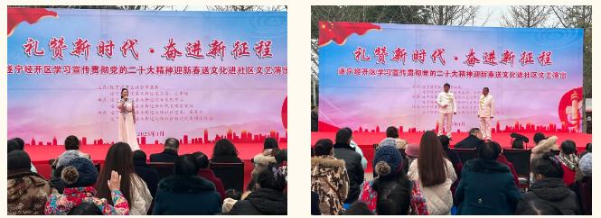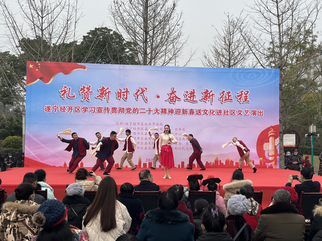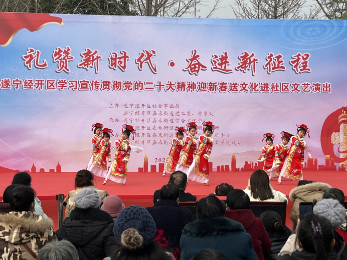 1月12日下午,遂宁经开区天峰社区明月居民休闲广场内一片欢歌笑语,一场以“礼赞新时代·奋进新征程”为主题,学习宣传贯彻党的二十大精神迎新春送文化进社区文艺演出在此举行。在新春佳节来临之际,嘉禾街道为辖区居民送上了一场精彩的“文化大餐”。