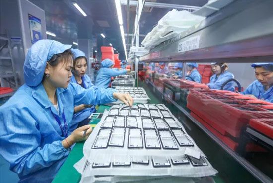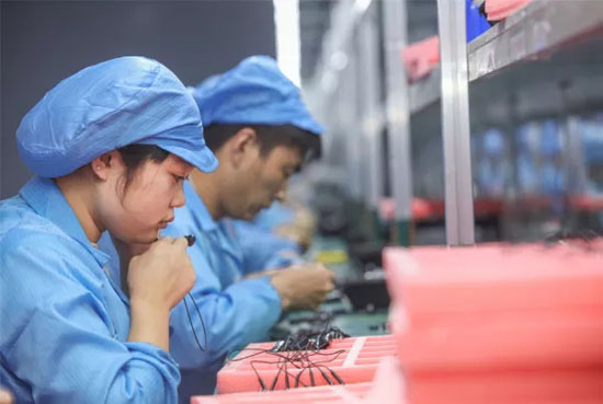5月8日,遂宁摩天时代科技过渡生产车间生产线上,工人正在加快生产蓝牙耳机与手机。