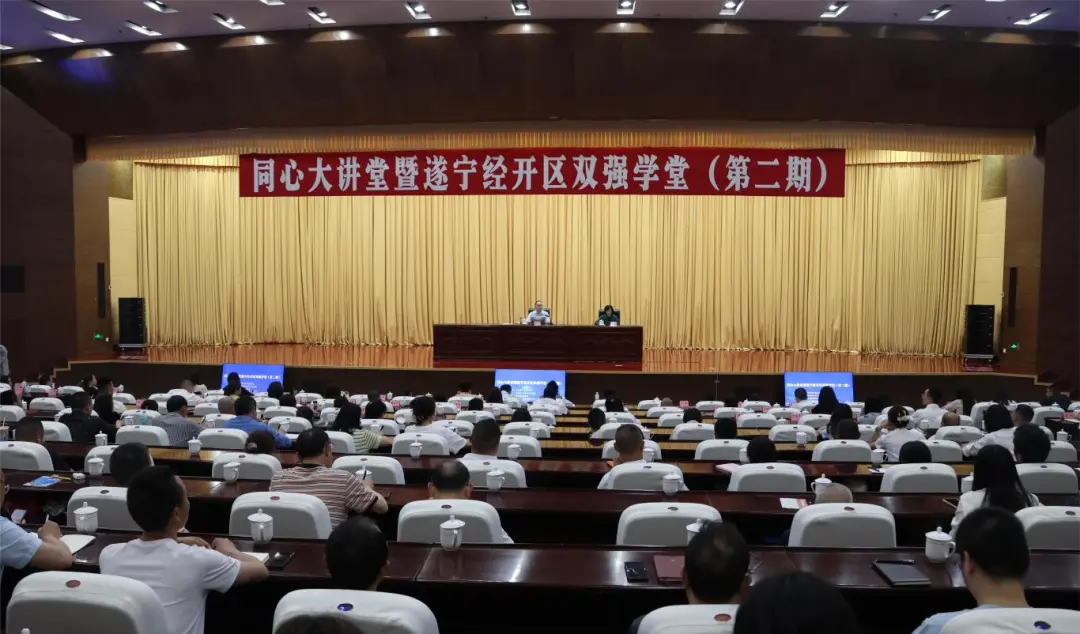 为更好地学习理解2024年全国两会精神,弘扬伟大建党精神,加快建设成渝中部现代化建设示范市和锂电之都,4月19日,由市委统战部、遂宁经开区非公企业党委主办的同心大讲堂暨遂宁经开区双强学堂(第二期)在市政府环岛商务中心开班。遂宁欧美同学会、市知联会、市新联会会员代表和遂宁经开区两新组织党员等参加讲座。