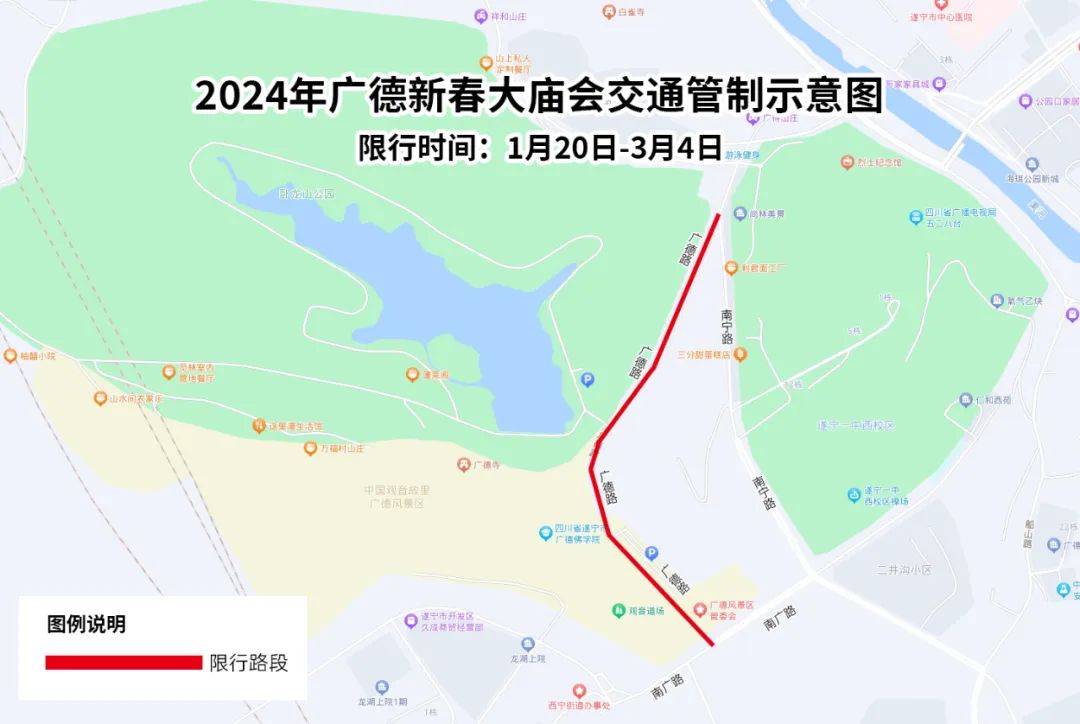 从@遂宁市公安局交警支队 获悉:2024年1月20日至2024年3月4日,遂宁市将举办2024年广德新春大庙会,为保障庙会顺利开展以及群众通行安全,1月20日-3月4日,遂宁公安交警将对广德路南宁路口至广德路南广路口进行交通管制,禁止除应急车辆以外的所有机动车通行,请过往机动车驾驶员提前规划行车路线。