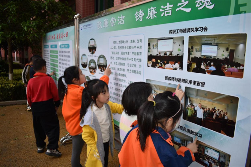 学高为师,身正为范。学校将师德师风建设作为推进“清廉学校”建设的关键环节,通过签订师德师风承诺书、观看反腐倡廉警示教育片、开展师德师风讲座、师德标兵评选等内容丰富、形式多样的清廉活动,拓展清廉文化建设深度,弘扬崇廉拒腐的校园风尚。学校将“一路清风”阵地建设在家长接送孩子的聚集点,师德师风工作接受社会及家长的监督,营造清正教风。
