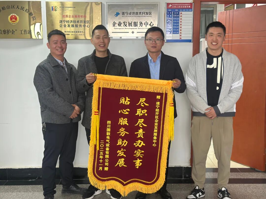 近日,四川国敦电气设备有限公司负责人专程来到遂宁经开区企业服务中心,将一面写有“尽职尽责办实事 贴心服务助发展”的锦旗郑重送至中心,感谢其在企业厂房项目建设过程中提供的全方位支持。