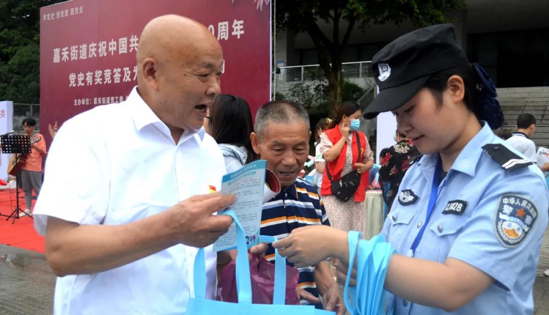 党史有奖竞答环节,在场党员干部、群众、学生纷纷踊跃答题,现场气氛热烈。现场,还为群众带来了免费检测体质、“党史阅读”、反诈宣传、“6.26”禁毒宣传等“我为群众办实事”系列活动。“活动丰富多彩,互动性也很强。”市民唐将说,街道组织的系列活动让市民重温百年党史,精彩且具有教育意义。