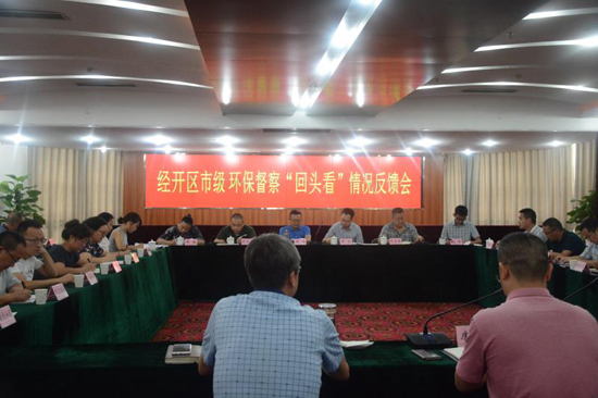 区党工委副书记、管委会主任唐统代表经开区就市级环保督察“回头看”反馈意见进行表态发言:我区将高度重视反馈意见,进一步深化对中、省、市关于生态文明建设、环境保护等重大决策部署的认识,认真研究落实环境保护工作,坚定不移的走环保优先、绿色发展之路;立说立改,狠抓落实,全区各级各部门将进一步举一反三,主动开展自查自纠;对督察组交办的反馈意见,主动认领、全部接收,并及时建立问题台账,按照一个问题、一个责任单位、一名责任人、一套方案的原则一抓到底,能立即解决的立行立改、逐条落实,逐一销号,不能立即解决的制定方案、限时整改,同时,加强跟踪督办,严格责任追究;坚定目标,巩固成果,我区将以此次督察“回头看”为契机,坚守督察整改成果,并进一步坚定绿色发展理念,加快传统制造业绿色化改造,培育壮大节能环保和新能源产业,促进产业转型升级。