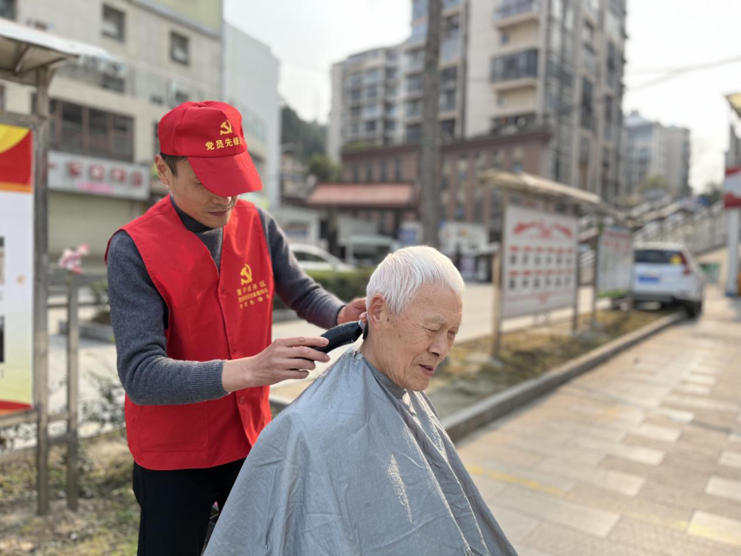 下午3时,阳光明媚,春风和煦,身穿红马甲的社区副书记廖春林正熟练地为老人理发,理发前廖春林总要仔细地询问老人的需求,按需提供服务,理发时也会和老人话家常,整个活动过程充满了欢声笑语。