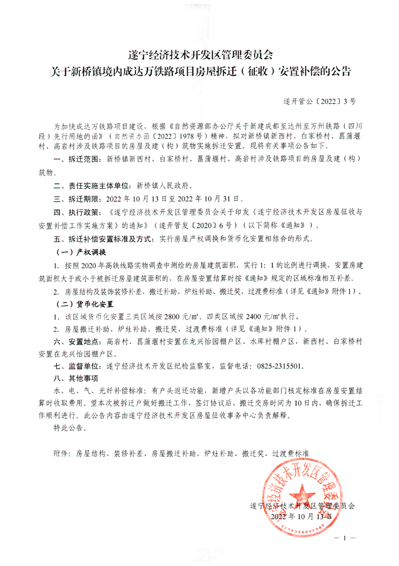 关于新桥镇境内成达万铁路项目房屋拆迁(征收)安置补偿的公告(遂开管公[2022]3号)