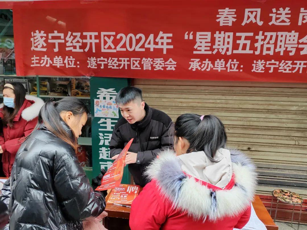 据了解,为全面贯彻落实党的二十大精神和党中央、国务院关于稳就业工作决策部署,推进实施就业优先战略,进一步加强人力资源和劳动力市场供需对接,推动实现高质量充分就业,充分抓住春节前后劳动者换岗流动高峰期和企业复工复产关键期,全力保障稳就业、保就业、促发展,遂宁经开区特开展以“春风送岗促就业·精准服务促发展”为主题的“2024年春风行动暨就业援助月”系列活动,其中“星期五招聘会暨就业援助月乡镇专场招聘会”于2月1日正式启动,春节前后先后走进蓬溪县任隆镇、船山区复桥镇、大英县隆盛镇、安居区横山镇、大英县回马镇、安居区拦江镇、船山区桂花镇、船山区龙凤镇、船山区永兴镇、船山区保升乡等10个乡镇,将岗位送到老百姓家门口。
