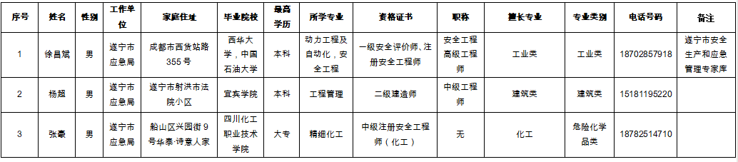 遂宁经开区应急管理和安全生产专家库拟增补名单