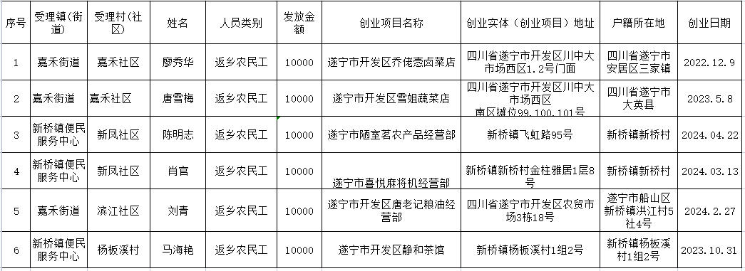 遂宁经济技术开发区2025年4月创业补贴公示名单