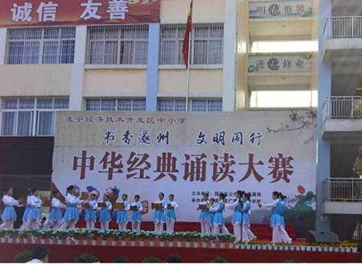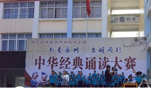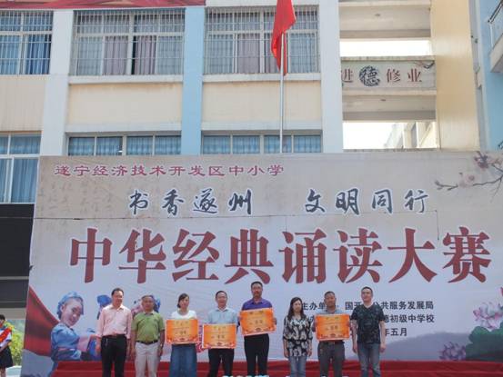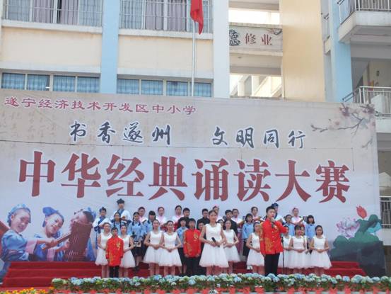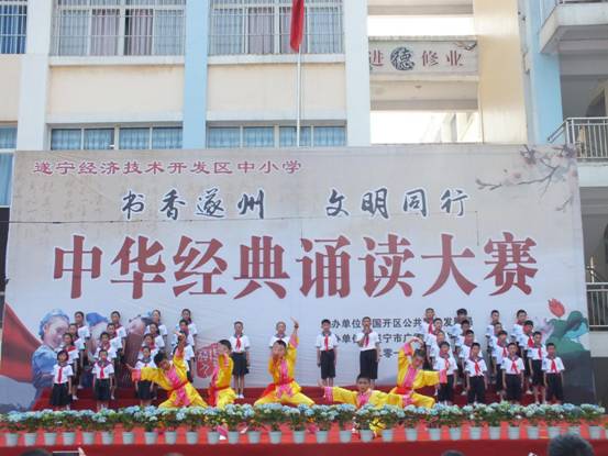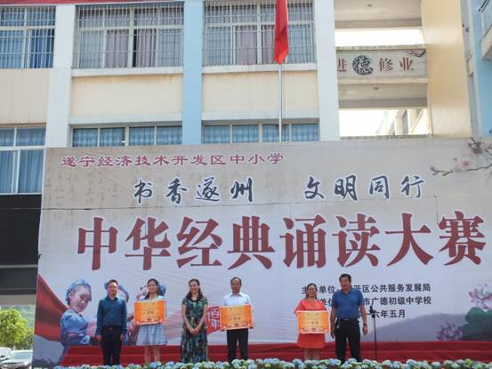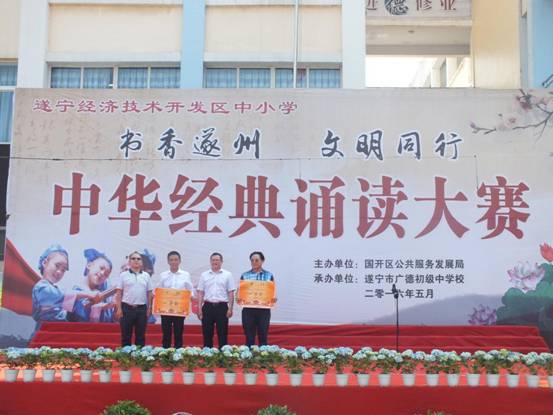 “书香遂州、文明同行。”5月10日上午,由遂宁经开区公共服务发展局主办、遂宁市广德初级中学校承办的遂宁经开区教育系统2016年“书香遂州、文明同行——中华经典诵读大赛”在广德中学举行。公服局局长颜真、综合办副主任董成、党群部副部长王红光、发展改革局副局长李春等经开区部门主要领导莅临大赛现场。来自全区14所中小学校的代表队参加了本次大赛。