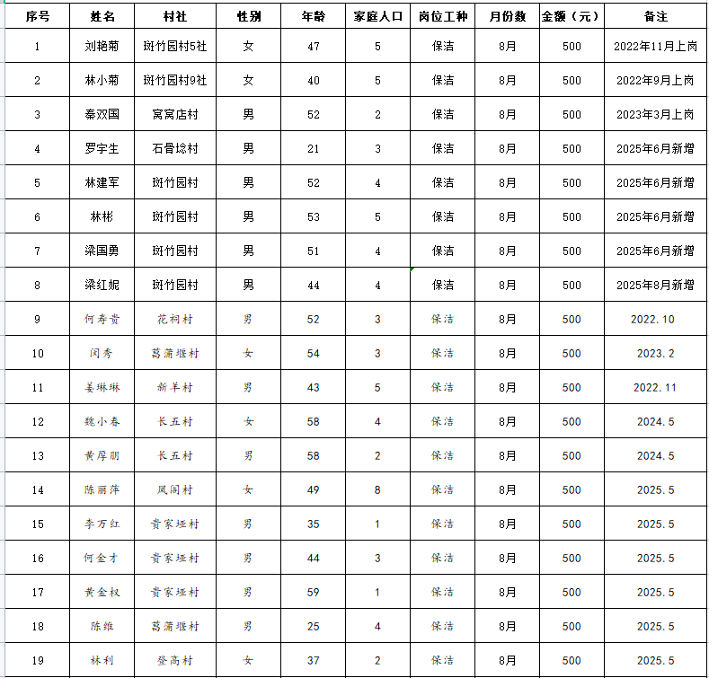 2025年8月经开区就业扶贫公益性岗位补贴发放花名册