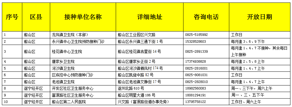 重要公示 遂宁市新冠疫苗接种点汇总 广大群众朋友们: 为方便群众接种,现将遂宁市新冠疫苗接种点开放情况汇总公示如下,各接种点具体开放时间、疫苗种类等,请大家提前电话咨询了解。 遂宁市新冠疫苗固定接种点安排公示 ↓ ↓