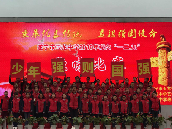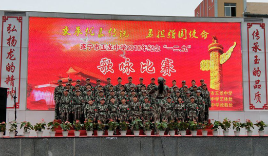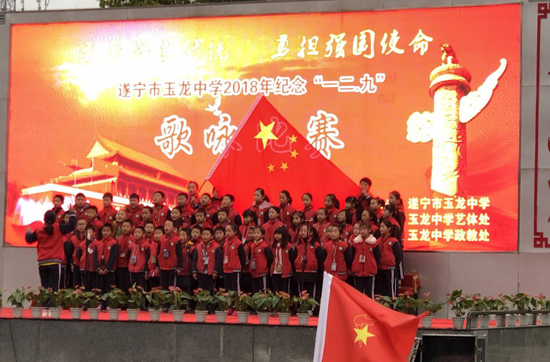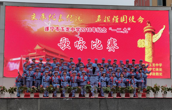 随后,参与比赛的36个班级依次上台演唱。7.3班以一首饱含深情的《中国中国,鲜红的太阳永不落》正式拉开了比赛的帷幕。《没有共产党就没有新中国》、《红星歌》、《红领巾相约中国梦》、《打靶归来》等一首首脍炙人口的爱国歌曲,或慷慨激昂,或饱满抒情,或温柔婉约,把观众的记忆带回了那战火纷飞、生死存亡的民族危难时刻,令观众们不由自主地陶醉在爱国情怀的伟大情感之中。舞台上,教师娴熟的钢琴伴奏,小指挥们有模有样的动作,演唱同学精神饱满、斗志激昂,嘹亮的歌声,整齐的队形,热情的观众,展现出了我校学生昂扬向上的良好精神风貌。其中8.1班的《打靶归来》引起现场强烈反响。孩子们身着迷彩服,动作整齐划一,个个意志坚定,精神饱满,歌声豪迈飞扬,彰显了玉龙学子英勇无畏、自主坚强的卓越风采。最后,全校师生同台表演的《国家》手语操为本次活动画上圆满的句号。
