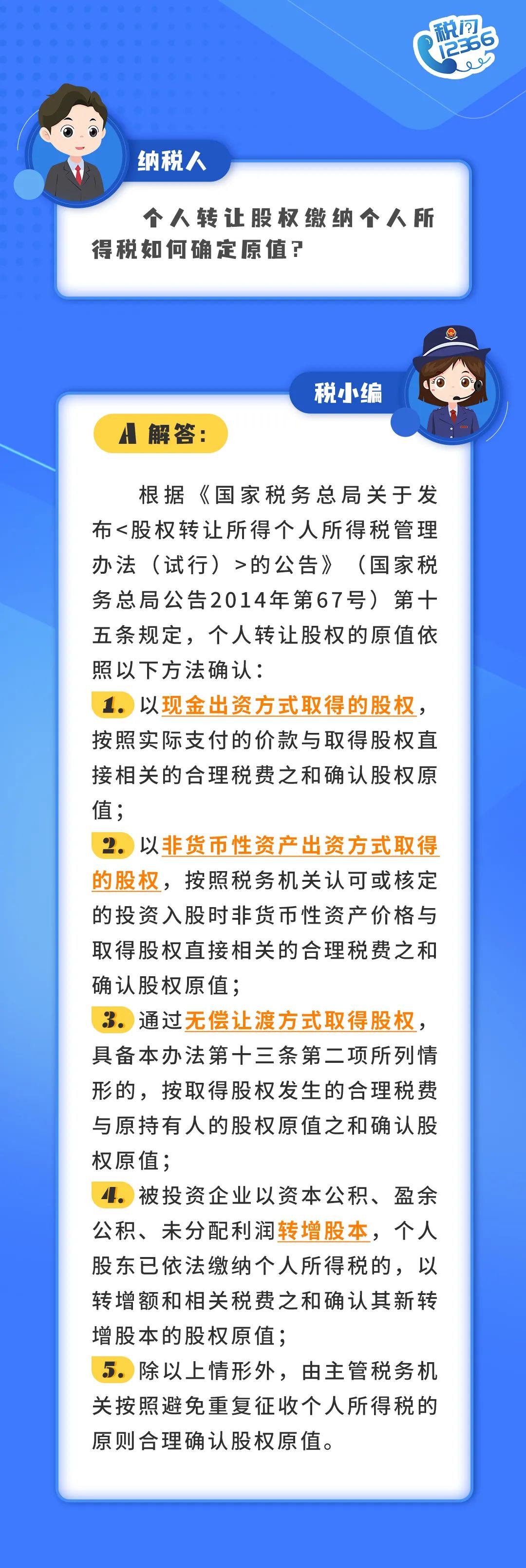 税问12366 | 个人转让股权缴纳个人所得税如何确定原值?