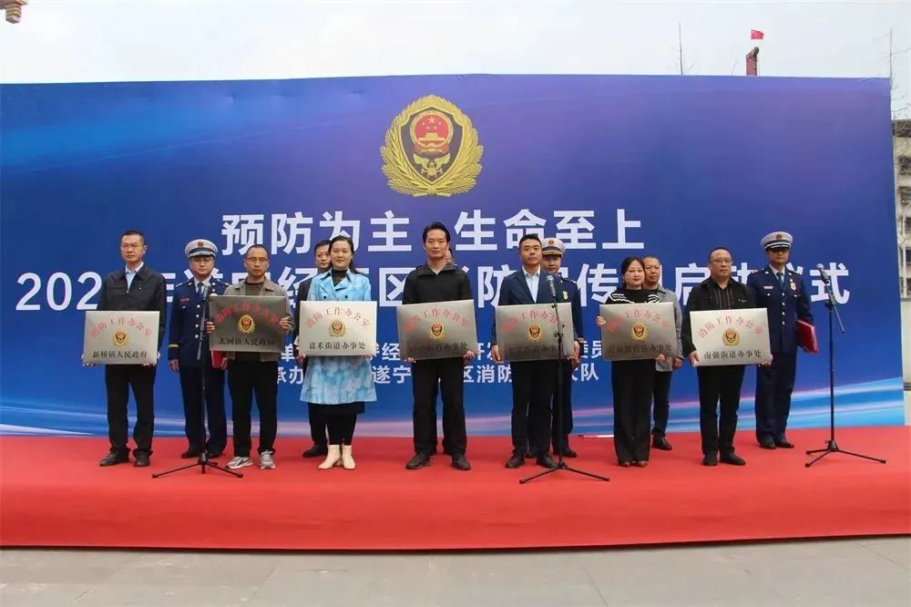 启动仪式上,与会领导为遂宁经开区新桥镇、北固镇等7个镇(街道)消防工作办公室进行授牌。