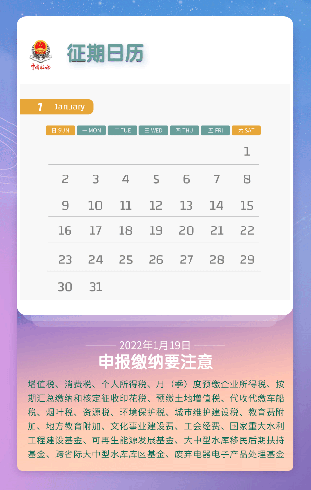1月纳税申报期限至1月19日,尚未完成纳税申报的纳税人,抓紧办理。