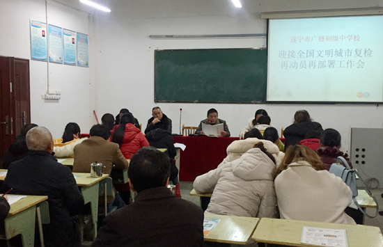 12月12日下午,广德中学组织教师召开了文明城市迎复检再动员再部署工作会议。会上,学校校长刘川传达了经开区文明城市迎复检再动员再部署工作会议精神和工作要求。就文明城市测评体系及复检流程作了说明,并对学校迎检工作进行了详细部署。刘川就当前工作强调,要进一步提高思想认识,加强组织领导,明确责任,加大宣传教育力度,做好创建文明城市问卷调查工作,大力宣传社会主义核心价值观,提高师生对文明城市创建工作的知晓率,把广大师生的积极性、主动性调动起来,形成人人参与、支持创建文明城市的浓厚氛围,推进创建工作扎实深入开展,确保复检顺利通过。 (王利)