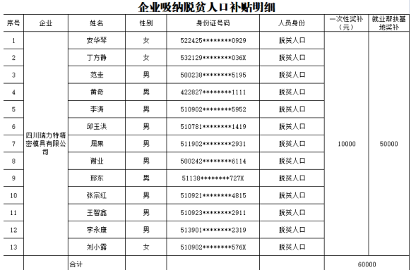 根据省人力资源社会保障厅等5部门《关于加强就业帮扶巩固拓展脱贫攻坚成果推进乡村振兴的实施意见》(川人社发〔2021〕26号),四川瑞力特精密模具有限公司申请企业吸纳脱贫人口相关补贴,经审核,符合文件要求。现将相关情况进行公示。公示期:2025年9月12日-9月18日。