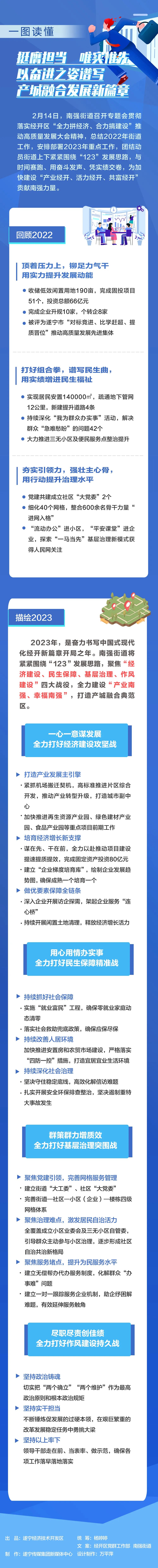 2月7日,遂宁经开区“全力拼经济 合力搞建设”高质量发展大会召开,动员全区上下锚定“百强晋位”总目标,全力推进“三产融合、三区协同”,奋力建设“产业、活力、共富”经开,全面奏响“123”发展主旋律,坚定不移书写中国式现代化经开新篇章。蓝图已经绘就。我区各单位将如何挥毫泼墨谱新篇?今起,我们推出【高质量发展谱新篇】专栏,紧扣区高质量发展大会精神,充分展示各单位在高质量推进项目建设、发展产业经济、提升城市能级、增进民生福祉等方面的生动实践和工作成效。