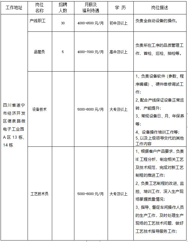 1、包吃包住;公司免费提供宿舍,4人/间,配备热水器、空调、开水机、洗衣房等,并免费提供夫妻房。