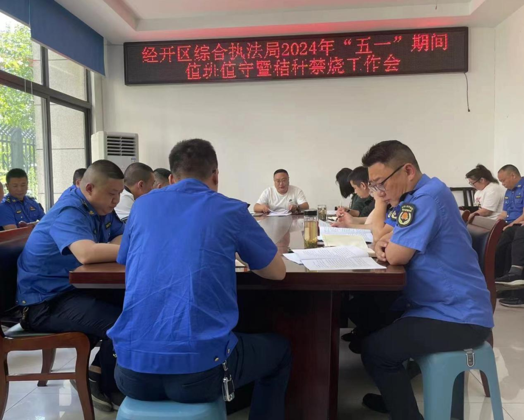 综合执法局及时组织相关部门召开2024年“五一”期间值班值守暨秸秆禁烧工作会,传达全区2024年秸秆禁烧暨大气污染防治工作会议精神,专题部署秸秆禁烧工作,细化分工、压实责任,确保重点时段、重点点位工作人员配备到位,并扎实做好秸秆禁烧宣传工作。