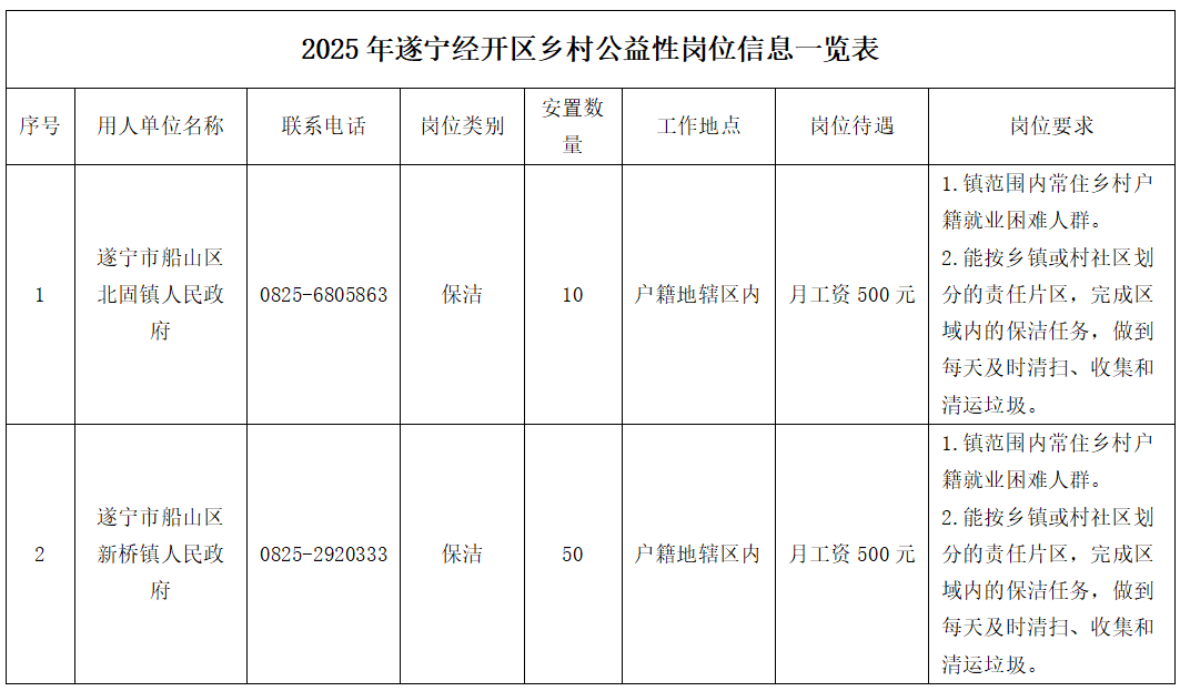 遂宁经开区农村户籍,有劳动能力和就业意愿,通过市场渠道难以实现稳定就业的乡村常住人口中的以下人员(公益性岗位补贴期限已满的除外):脱贫人口、防止返贫监测对象;持有《残疾证》的人员;正在享受农村最低生活保障待遇的人员;女性年满45周岁、男性年满55周岁及以上的大龄人员;零就业家庭成员;因照顾老人、儿童或重特大疾病患者、重度残疾人等家庭成员导致无法外出务工的人员。根据年龄、身体状况、家庭等因素,优先安置符合条件的脱贫人口、防止返贫监测对象特别是弱劳动力、半劳动力等特殊困难群体。
