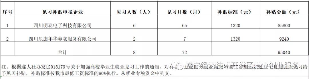 根据遂人社办发[2018]79号关于加强高校毕业生就业见习工作的通知,现将2021年7月就业见习补贴发放情况予以公示。补贴企业2家,补贴资金95040元,补贴人员8人,如有情况反映,请于7月6日前与遂宁经济技术开发区劳动保障与民政事务局联系。 公示期:5天 联系人: 杨箭虹 联系电话:0825-2361858 遂宁经济技术开发区劳动保障与民政事务局 2021年6月29日