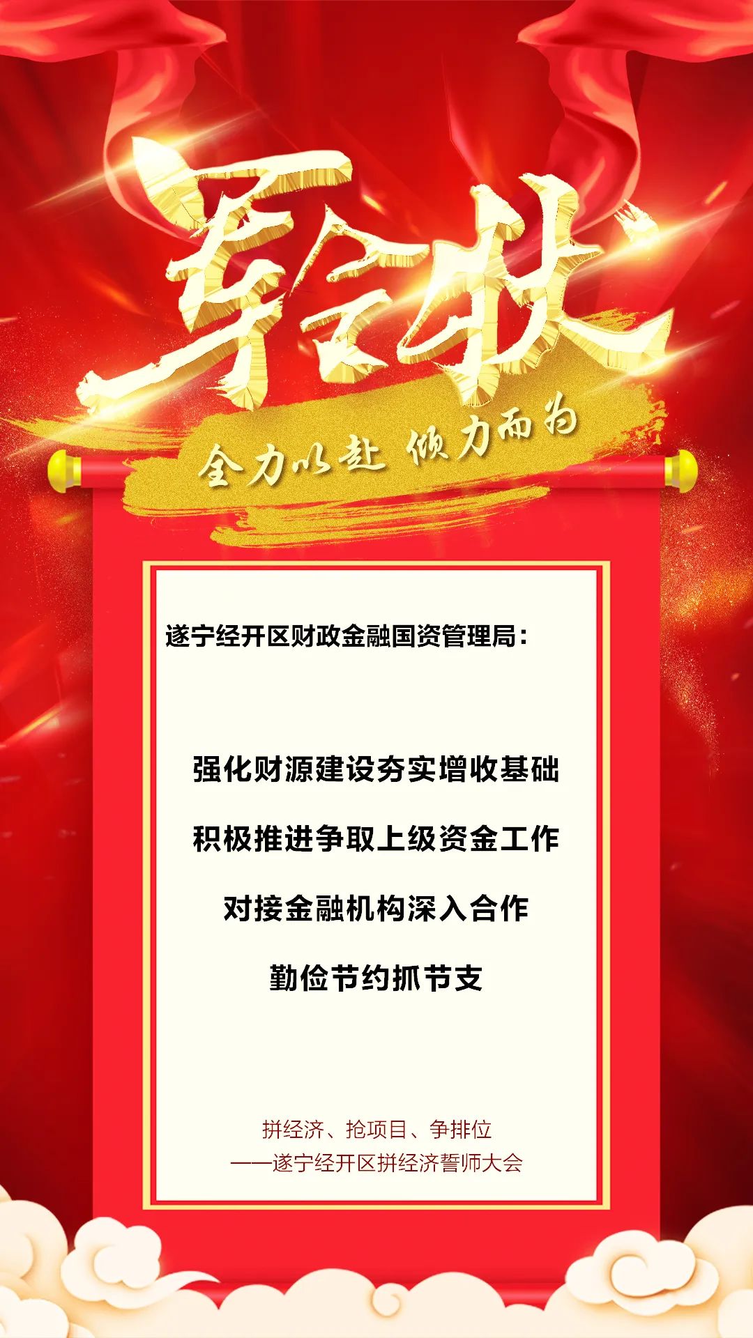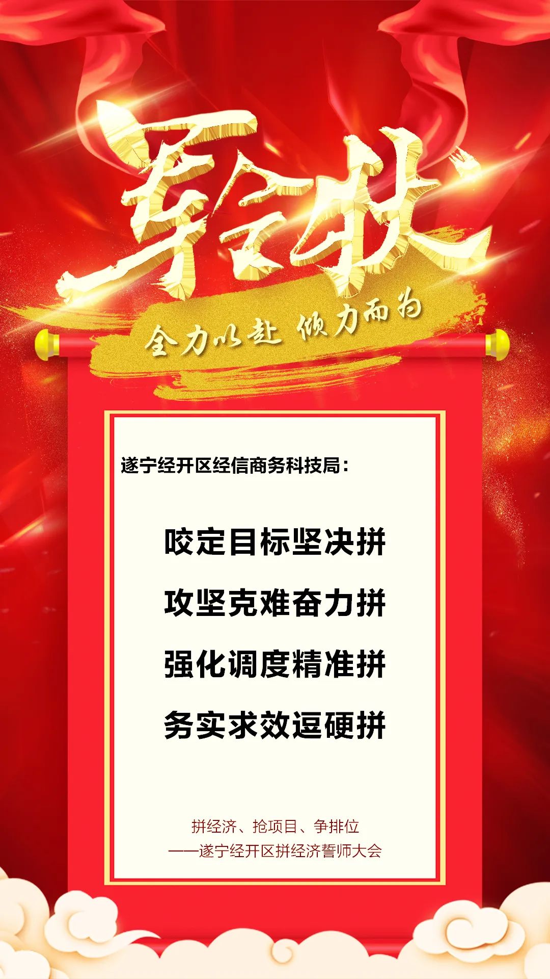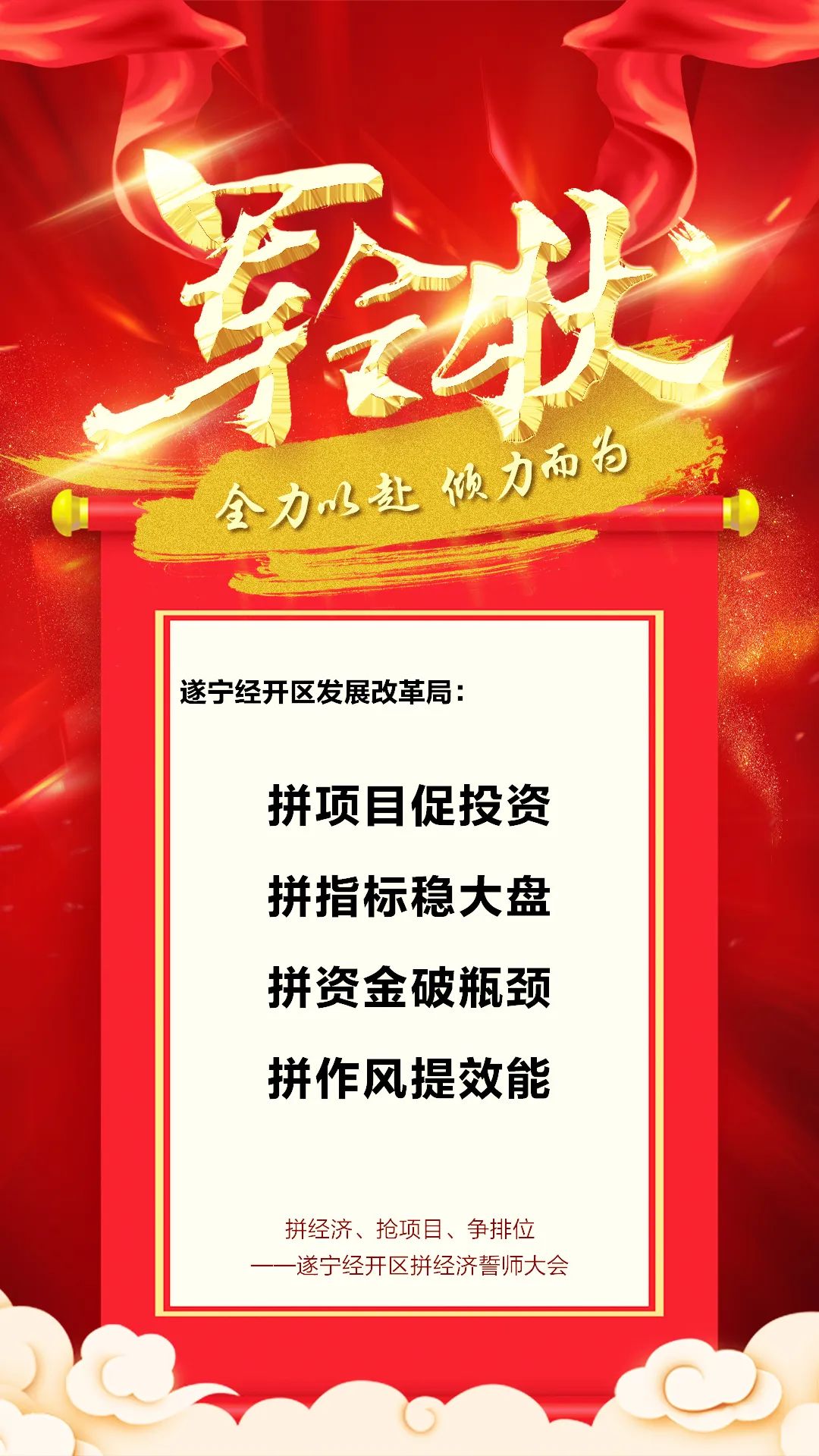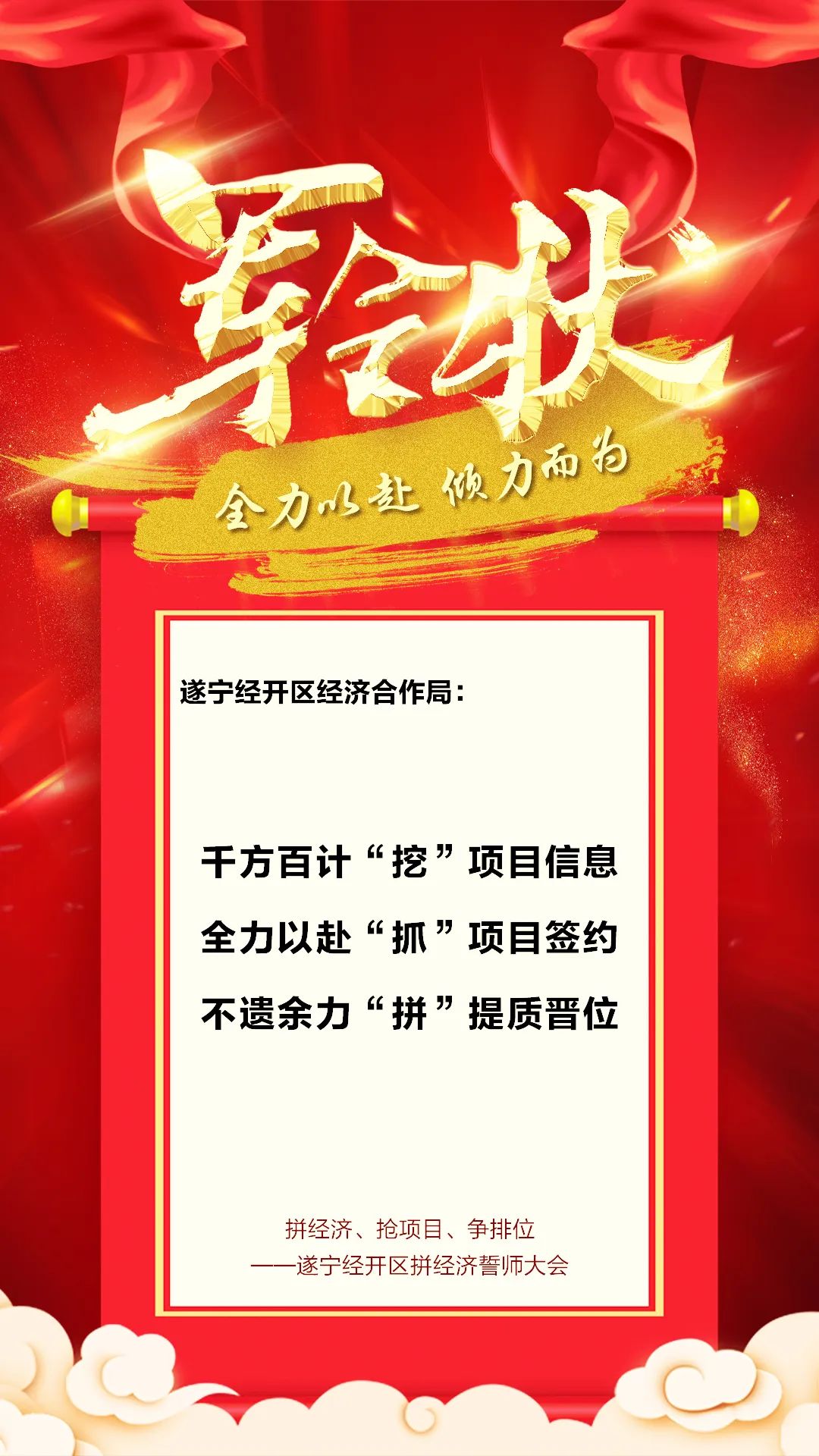 9月2日,遂宁经开区拼经济誓师大会上,相关部门就拼经济、搞建设作了表态发言。各部门表示,要进一步认清形势、统一思想、坚定信心,以冲锋冲刺的姿态和决战决胜的拼劲,抓实抓细拼经济、搞建设各项措施,坚决完成全年目标任务,以优异成绩迎接党的二十大胜利召开。