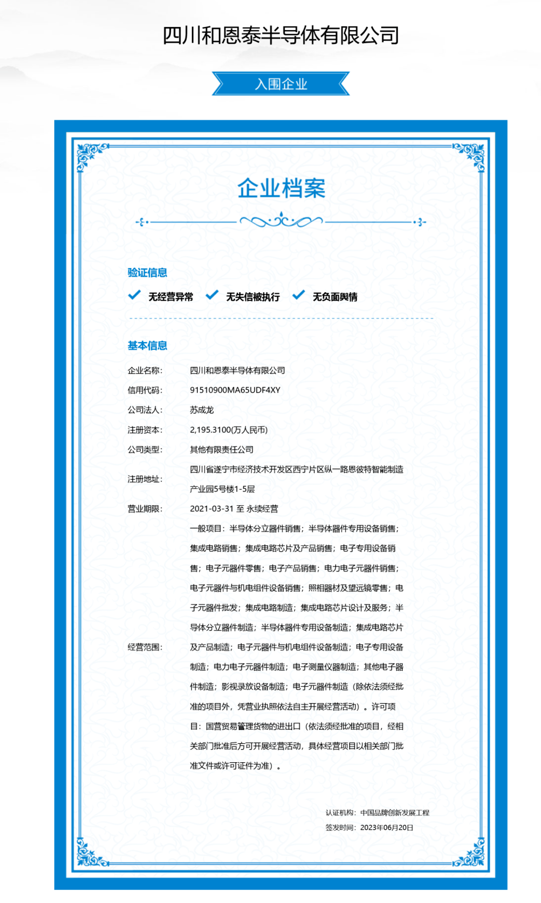 第九届中国影响力品牌峰会,主办单位系国务院新闻办中国互联网新闻中心,央视演播厅请到峰会现场,著名主持人康辉、朱迅等与优秀企业家现场对话,旨在挖掘企业品牌成长逻辑,展现企业品牌魅力。四川和恩泰半导体有限公司成功入围“中国品牌创新发展工程”中国企业品牌库,并获得《创新之路》栏目组的邀约,参与该栏目组对话访谈节目的录制。