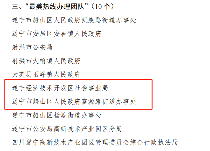 近期,由中共遂宁市委宣传部、遂宁市政府服务热线中心主办的“奋进新时代·争做最美热线人”评选结果出炉。经推荐报送、宣传展示和综合评审,最终评选出10名最美热线话务人员、10名最美热线办理人员、10个最美热线办理团队。其中,遂宁经开区社事局、富源路街道办事处获评“最美热线办理团队”。