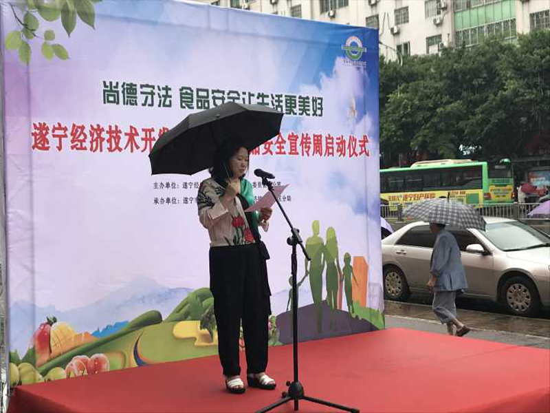 张明香致辞并宣布2019年经开区食品安全宣传周活动正式启动,她强调:开展食品安全宣传,旨在引导食品生产经营企业及从业人员学法、守法、用法、诚信经营,激发广大社会公众积极参与食品安全治理。希望各相关部门要加强组织领导,明确责任要求,突出宣传主题,以此次活动为契机,坚持有法必依、执法必严、违法必究,把好食品从农田到餐桌的每一道防线,希望广大群众积极参与,共同守护食品安全。