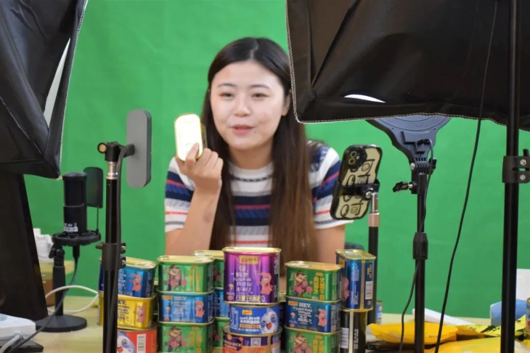 △19日上午9时许,遂宁市三丰食品有限公司主播通过镜头向观众展示手中的罐头。