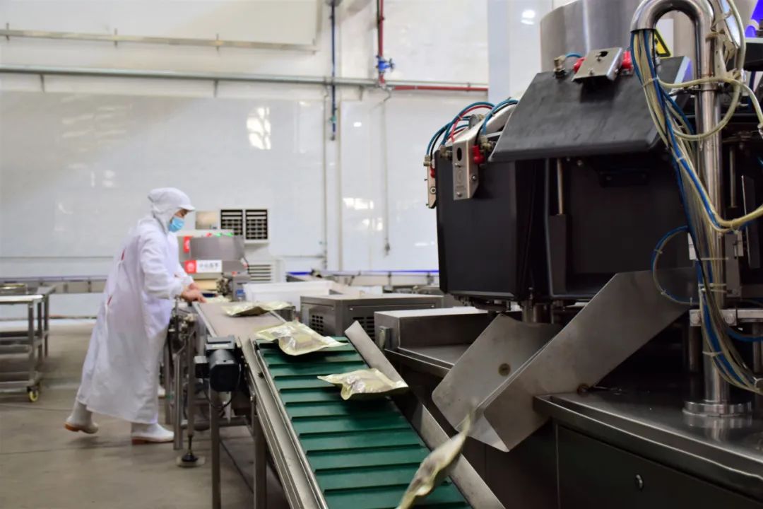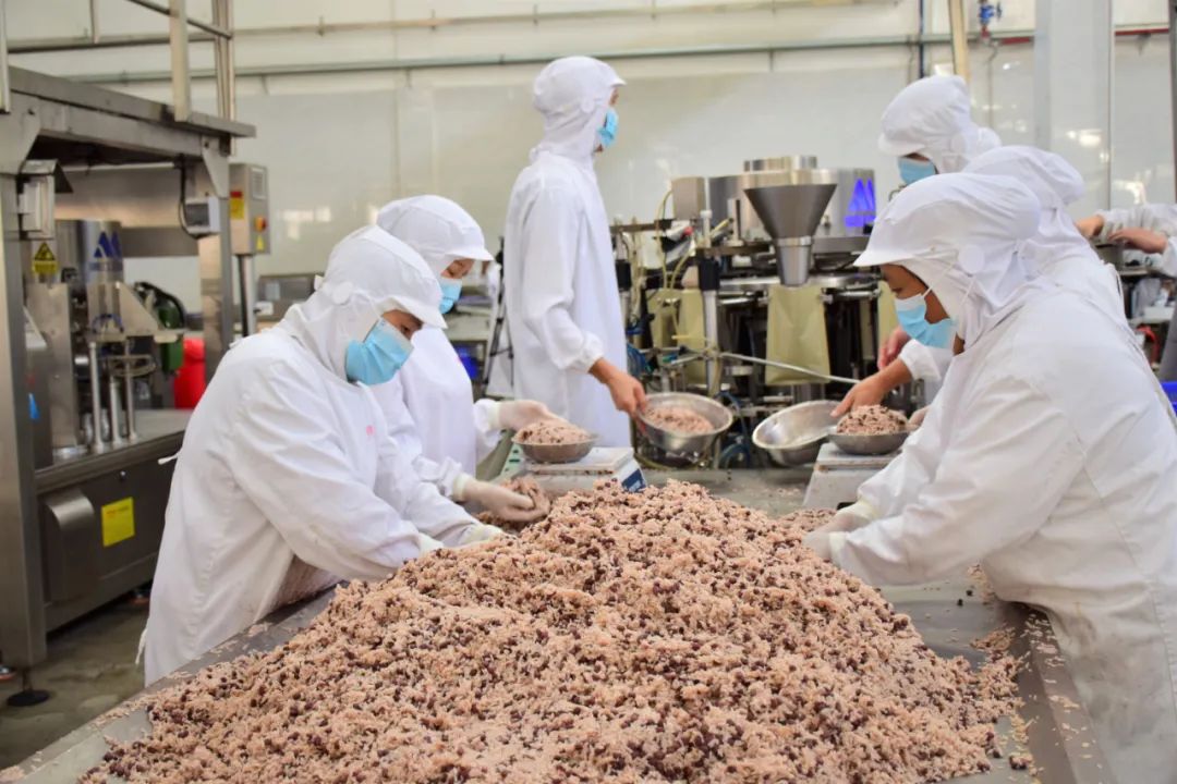 △四川美宁食品有限公司食品加工车间内工人加紧生产。