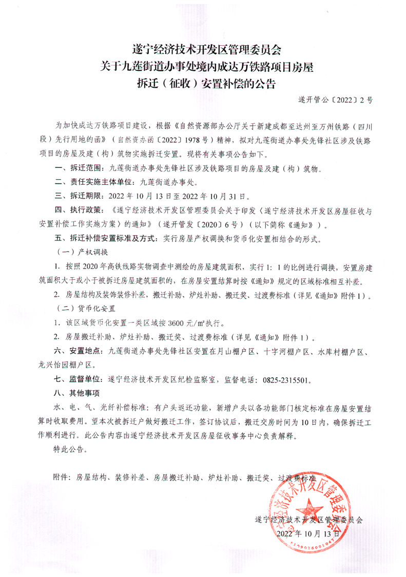 关于九莲街道办事处境内成达万铁路项目房屋拆迁(征收)安置补偿的公告(遂开管公[2022]2号)