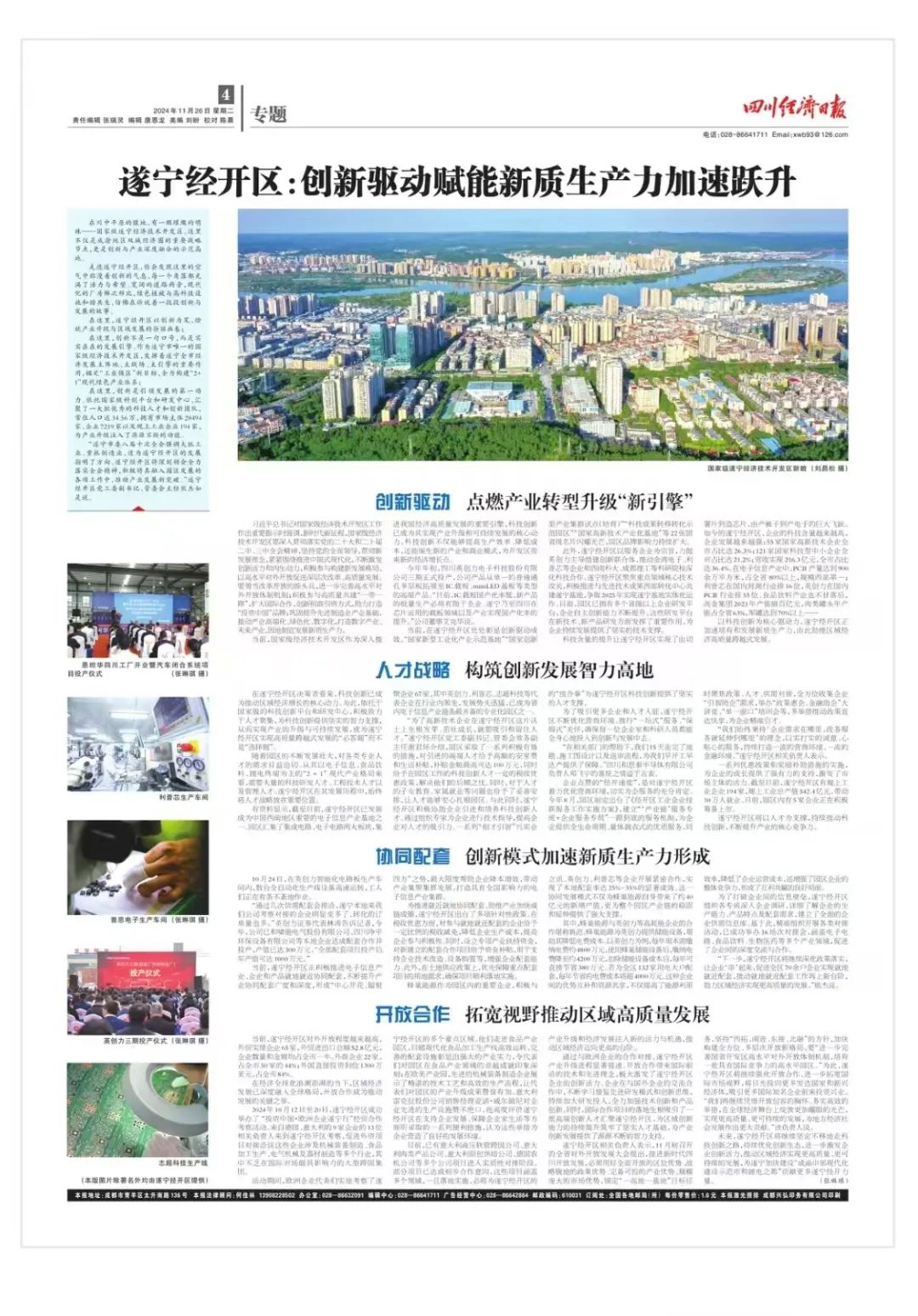 11月26日,四川经济日报第四版以《遂宁经开区:以创新驱动赋能新质生产力加速跃升》为题,关注遂宁经开区将创新与产业深度融合推动产业发展新突破。