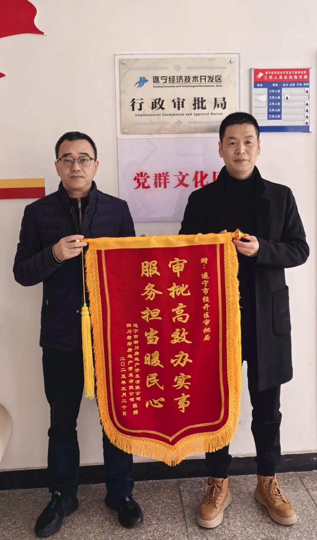“感谢你们的高效服务!”3月20日,遂宁经开区行政审批局企业开办服务窗口迎来暖心一幕:遂宁市新川房地产开发有限公司、四川君宏房地产开发有限公司负责人专程送来一面印有‌“审批高效办实事,服务担当暖民心”‌的锦旗,对窗口工作人员专业、高效的服务表达诚挚谢意‌。