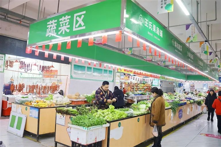 市民在各摊位前挑选着菜品,摊主忙着上秤结算,现场一片热闹的景象。“整个区域分为了蔬果区、肉类区、水产区、干杂区等,市场外还专门设置了40余个‘自产自销免费区域’,方便附近农户销售自产果蔬。”工作人员介绍。货品齐全、信息透明,再加上干净整洁的市场环境,让这里成为了附近不少市民买菜的首选地。